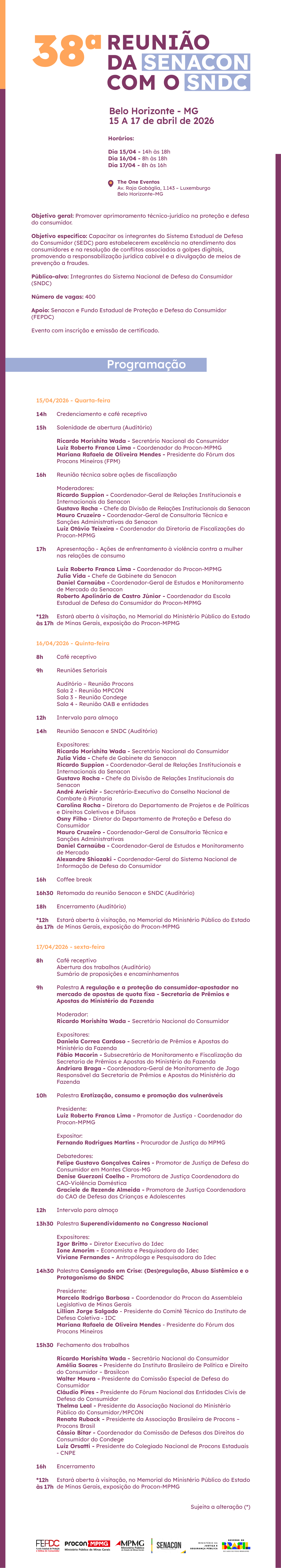 O Ministério Público de Minas Gerais (MPMG), por meio do Procon-MPMG, e a Secretaria Nacional do Consumidor (Senacon) iniciaram nesta quarta-feira, 15 de abril, em Belo Horizonte, a 38ª reunião da Senacon com o Sistema Nacional de Defesa do Consumidor (SNDC).